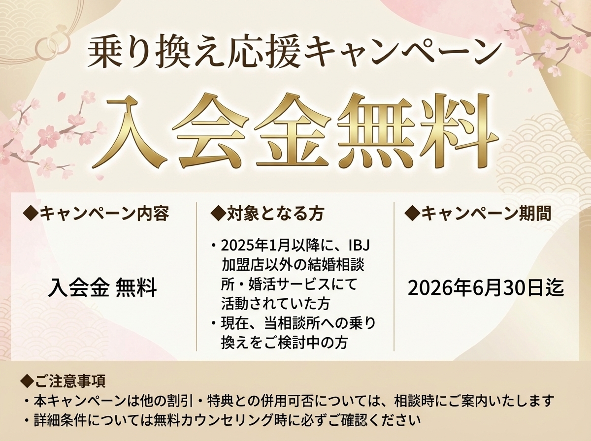 他社結婚相談所・婚活サービスからのご入会を検討されている方を対象に、期間限定で 「乗り換え応援キャンペーン」 を実施いたします。